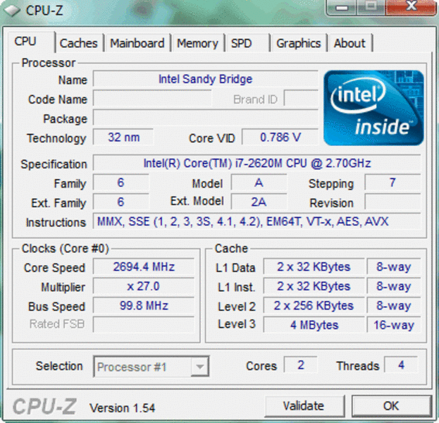 در ابتدای بررسی خود با پردازنده Intel Core i7-2620M CPU (2×2.7 GHz) آشنا شدیم از Apple Macbook Pro 13 inch (2011-02 MC724LL/A). این پردازنده سریع ترین پردازنده دو هسته ای Sandy Bridge است که در اوایل سال 2011 ارائه شده است. CPU تمام ویژگی های خاص معماری Sandy Bridge از قبیل Hyper-Threading را برای استفاده کارآمد و هر چه بهتر از هسته های چندگانه و Turbo Boost 2.0 برای اورکلاکینگ اتوماتیک (3.4 گیگاهرتزی) ارائه می دهد. برای جزئیات بیشتر به لیست مشخصات اینتل Core i7-2620M مراجعه کنید.