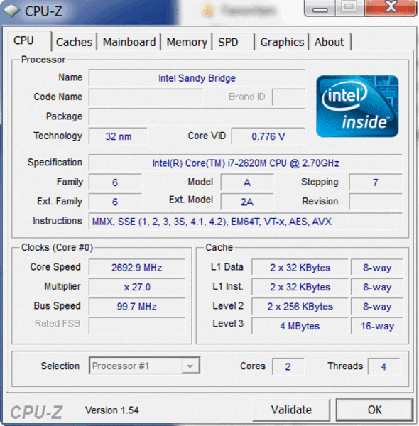 • پردازنده Intel Core i7-2620M 2x 2.70GHz
