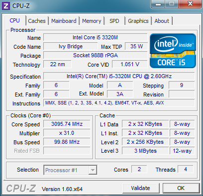 دستگاه مورد بررسی ما دارای پردازنده Core i5-3320M است، پردازنده اصلی اینتل Ivy Bridge دو هسته ای و یک کلاک اسمی 2.6 گیگاهرتزی است. از طریق توربو بوست 2.0 ، CPU می تواند کلاک را تا 3.1 گیگاهرتز (2 هسته ای) و 3.3 گیگاهرتز (در 1 هسته ای) به ترتیب افزایش دهد؛ با توجه به اینکه ذخیره مصرف انرژی و دما نیاز است. i5-3320M با جدیدترین فرایند 22 نانومتری اینتل با ترانزیستورهای Tri-Gate ساخته شده و دارای TDP مشخص 35 واتی است.
