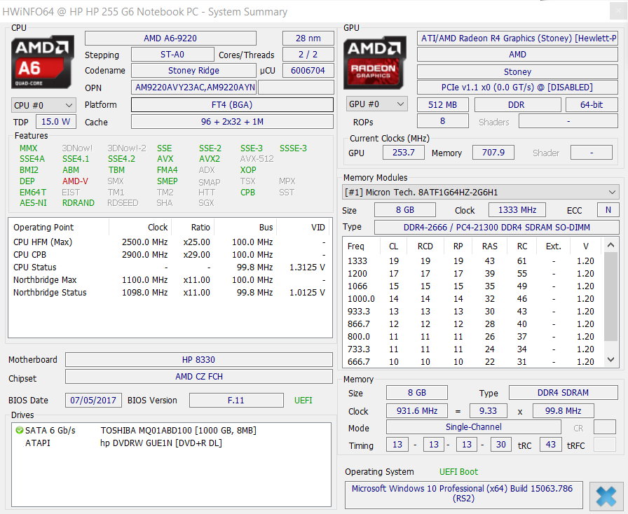 پردازنده داخلی AMD یک A6-9220-APU است که برای کارهای ساده مناسب است. دو هسته CPU با فرکانس 2.5 تا 2.9 گیگاهرتز کار می کردند و 15 وات انرژی مصرف می کردند. بنابراین A6-9220 برای نوت بوک های سبک و موبایل مناسب است. حافظه فقط در حالت تک کانال قابل دسترسی است. در مقایسه با Acer Aspire 3 A315-21-651Y، عملکرد 255 G6 کمی کمتر از حد انتظار است.