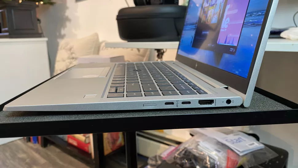 Elitebook 845 G7 با تمام درگاههای مناسب همراه است. در سمت راست، یک شکاف کارت NanoSim، دو درگاه USB Type-C ،HDMI و یک درگاه برق پیدا میکنیم. در سمت چپ خواننده SmartCard ، یک جک صوتی 3.5 میلی متر، دو درگاه USB Type-A و یک شکاف قفل قرار دارد.